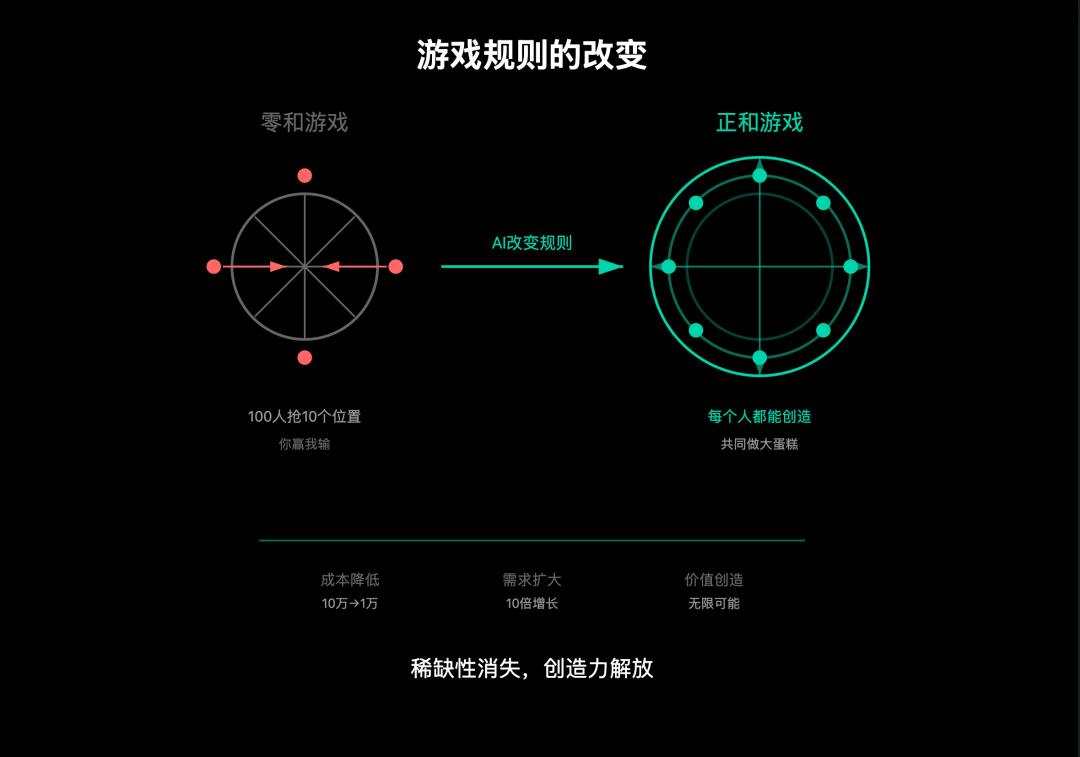 成本低了,蛋糕就大了。100个人抢10个项目?不。每个人都能接项目。效率10倍,需求也10倍。以前做个网站10万。现在1万。买得起的人多了10倍。市场大了。