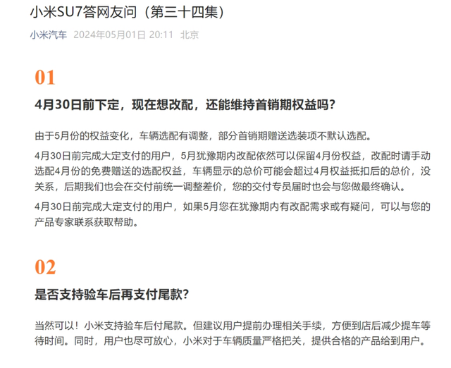小米汽车曾在答网友问中明确表示小米支持验车后再付尾款