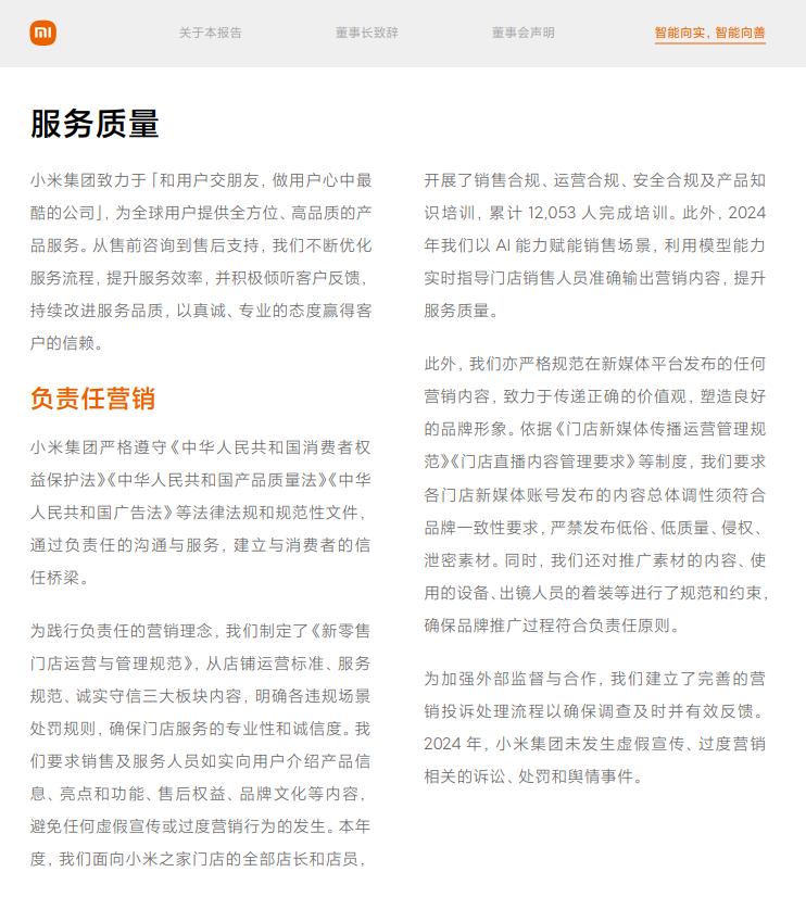 在小米2024年的ESG报告中,其写有这样一段话:“我们不断优化全方位的服务体系,始终为消费者提供可信、贴心的服务体验,坚守「与用户交朋友」的初心。”但就目前小米汽车出现的争议来看,小米在S(社会)与G(治理)层面还存在可优化的空间。