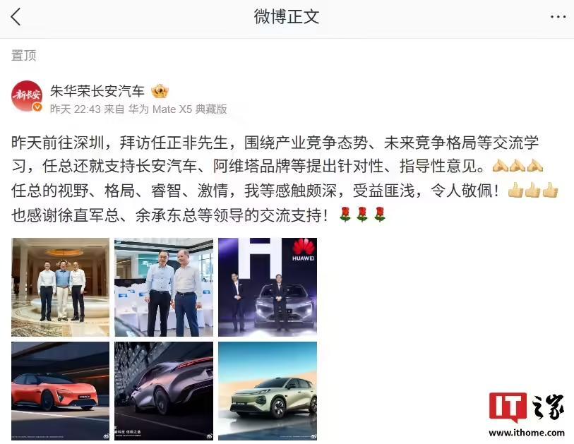 IT之家 8 月 10 日消息,长安汽车董事长朱华荣昨日晚发文称自己前往深圳拜访了任正非先生(华为董事、CEO),并围绕产业竞争态势、未来竞争格局等交流学习。
