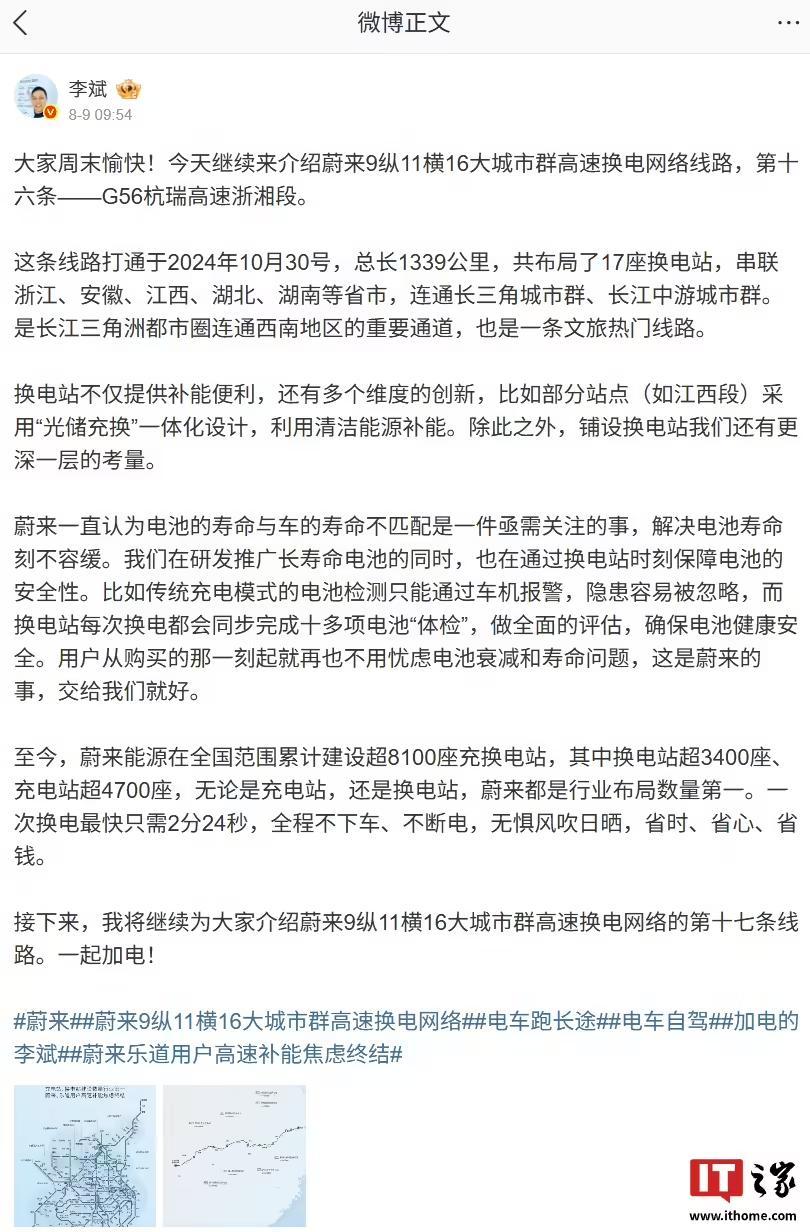 IT之家 8 月 10 日消息,蔚来创始人、董事长、CEO 李斌昨日发文,介绍了蔚来 9 纵 11 横 16 大城市群高速换电网络线路第十六条 ——G56 杭瑞高速浙湘段。