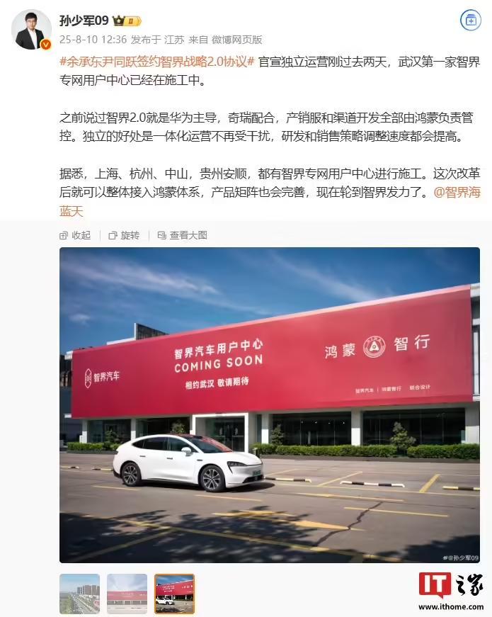 据博主 @孙少军 今日透露,在品牌战略 2.0 官宣独立运营刚过去两天,武汉第一家智界专网用户中心已经在施工中。另外,上海、杭州、中山,贵州安顺都有智界专网用户中心进行施工。这次改革后就可以整体接入鸿蒙体系,产品矩阵也会完善。