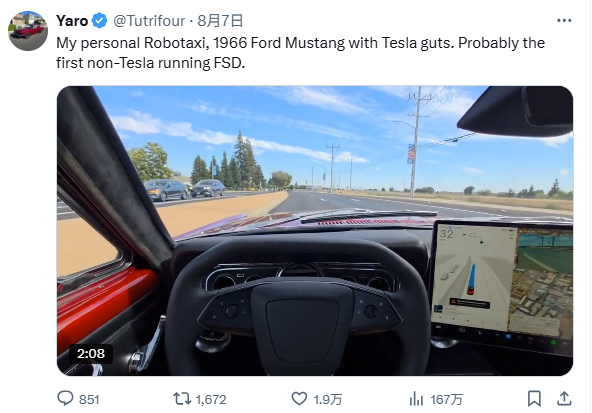当然,老外爱改装倒不是什么稀奇事,不过这次不一样的是,这位“神人”直接把特斯拉 FSD 移植到了 1966 年的福特野马上。