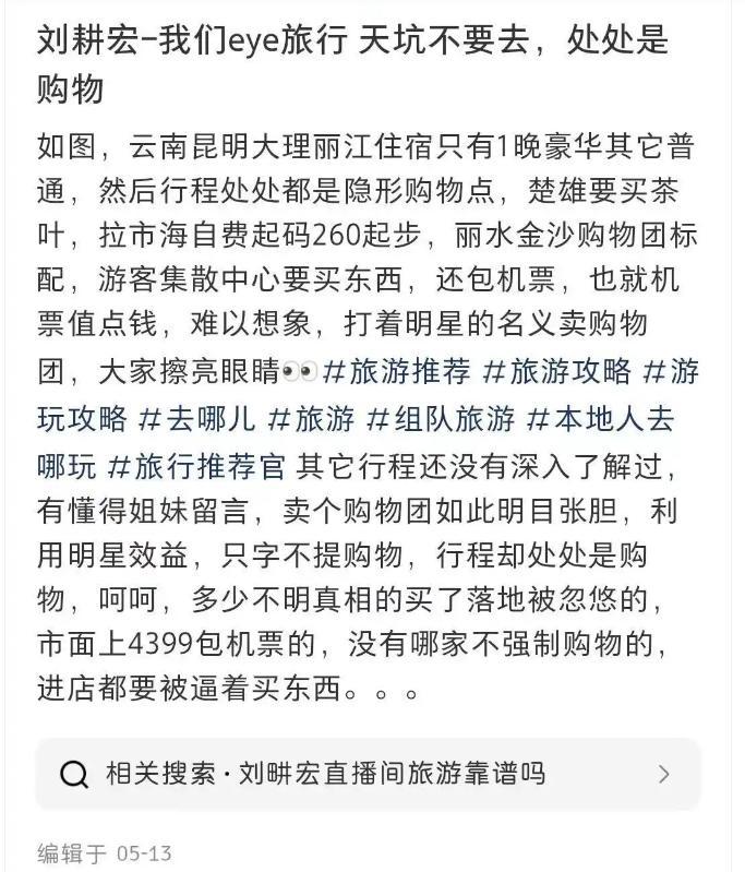 同年5月,一位网友在社交媒体发文称,“刘畊宏-我们eye旅行”推荐的旅行产品强制购物。
