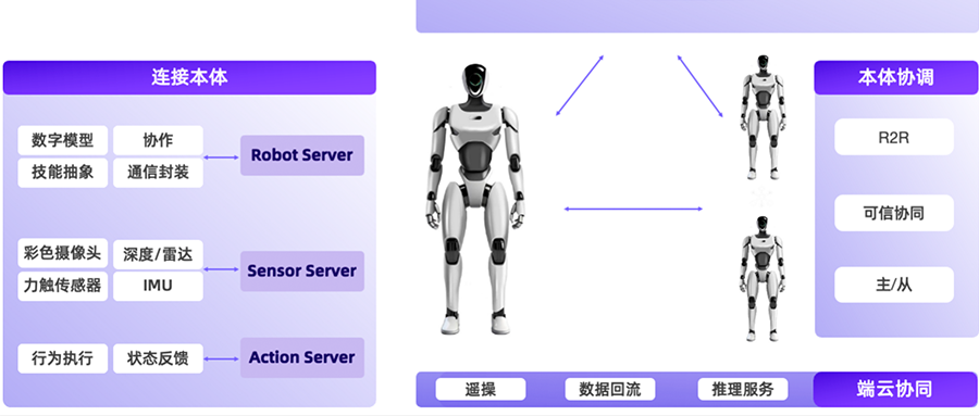 RCP目前实现的主要功能包括:提供机器人本体及相关传感器能力的抽象,对外提供各种功能,并通过标准协议、不同的传输层和模型服务进行交互;RobotMotion作为云端推理与机器人本体控制之间的桥梁,将离散的低频推理命令实时转换为高频的连续控制信号,驱动机器人完成运动任务。此外,它还配备了运动规划与控制所需的工具包,助力具身智能融入物理世界。