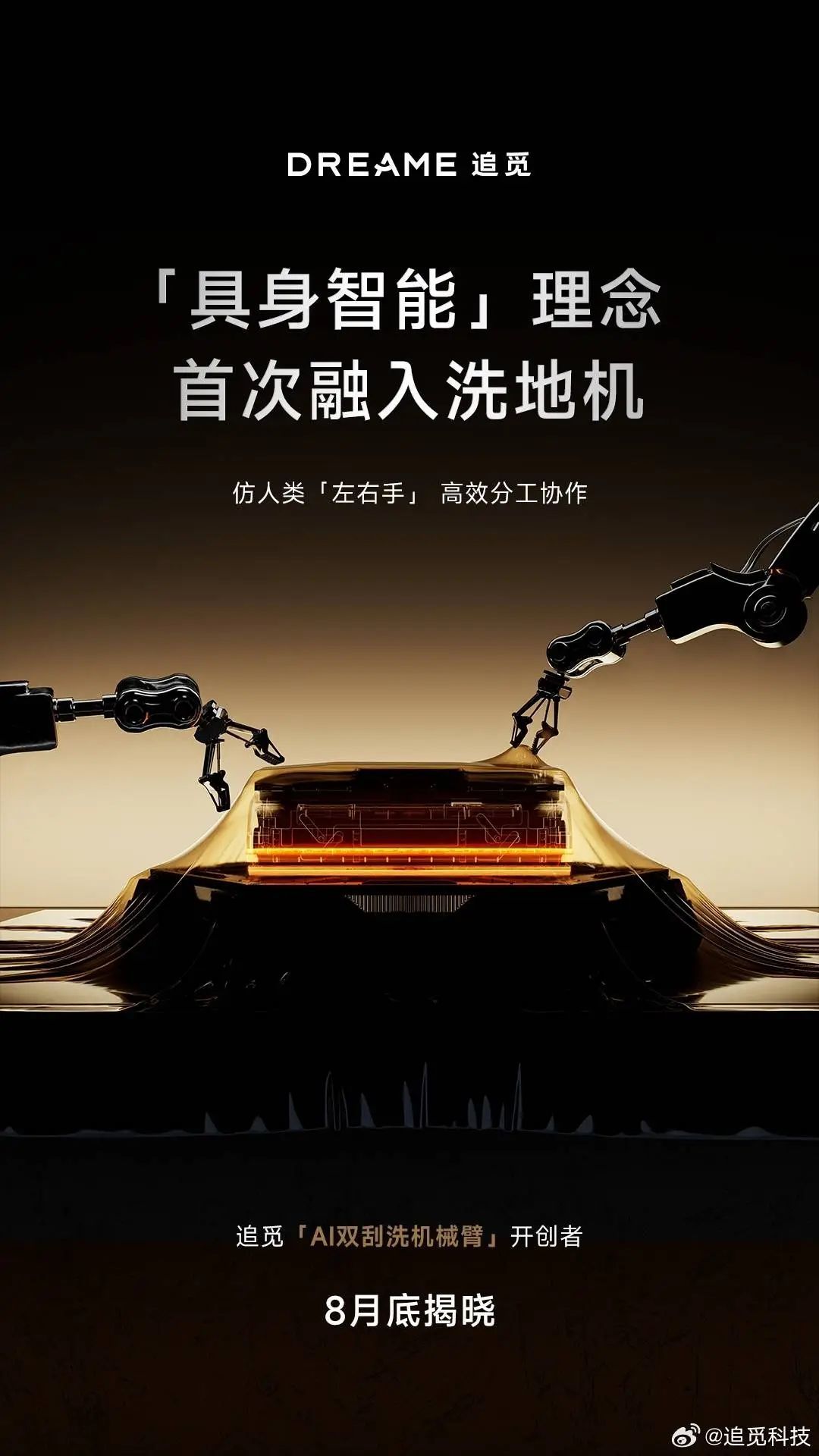 8 月 11 日,追觅科技宣布,将在本月底发布全球首款「双机械臂洗地机」。