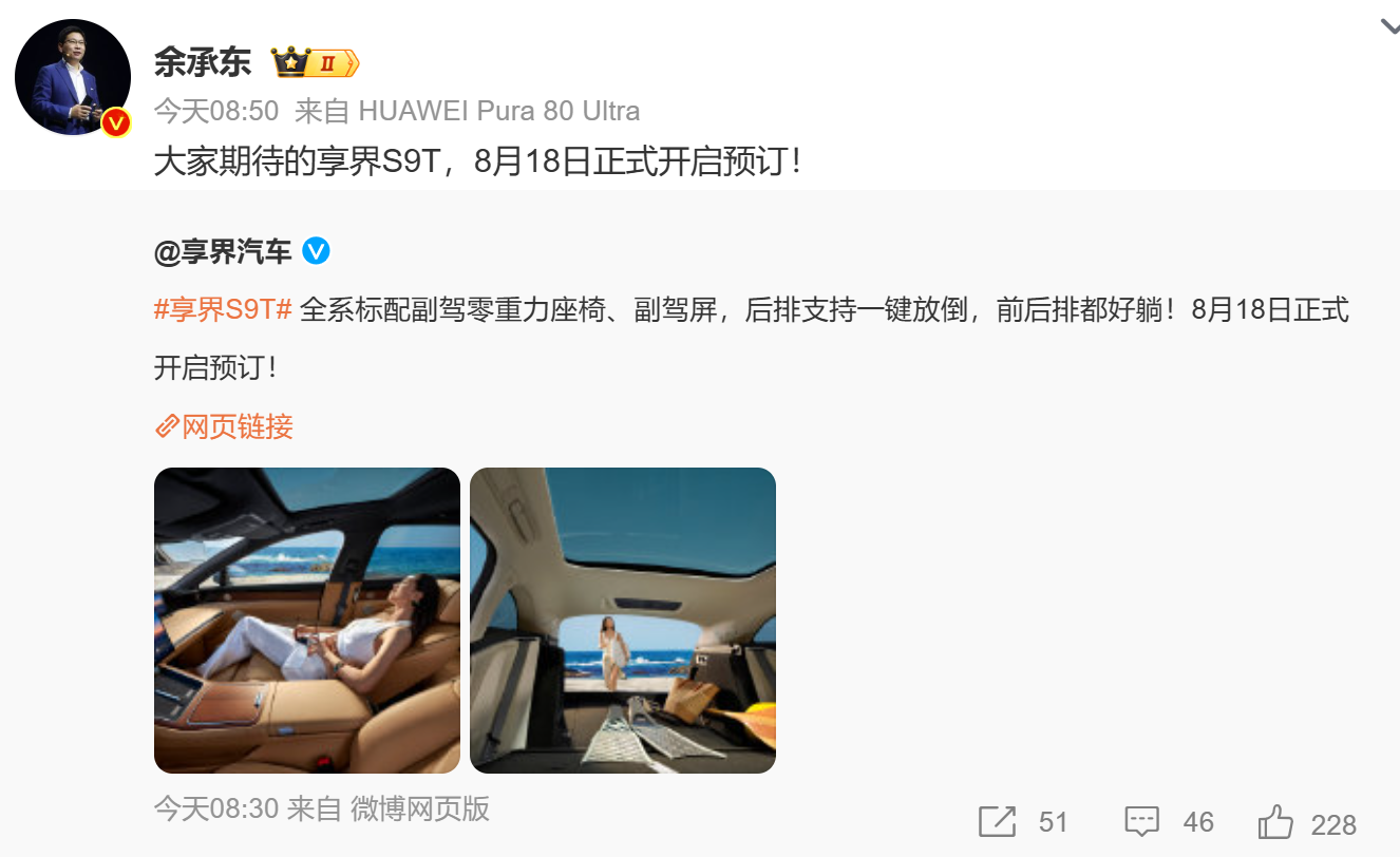 据悉,现款享界S9售价区间为30.98-44.98万元。