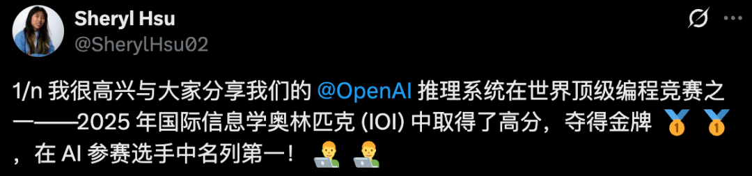 刚刚,OpenAI研究员Sheryl Hsu官宣:其内部研发的AI推理系统,在全球顶级编程竞赛——2025年国际信息学奥林匹克竞赛(IOI)中,取得了金牌