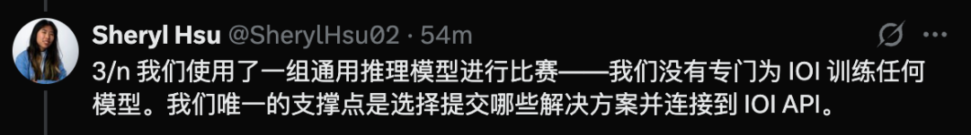 Sheryl Hsu在推文中特别强调,OpenAI的AI系统是在完全模拟人类选手的环境下进行比赛的: