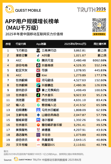 据QuestMobile 2025半年度APP用户规模增长榜单(MAU千万级)显示,截至今年6月,汽水音乐月活规模同比增长态势近乎翻倍,以9922.33万直逼亿级大关。与之呼应,截至稿前,汽水音乐在Apple store免费app排行榜上位列第6,网易云音乐与腾讯音乐旗下“拳头产品”QQ音乐、酷狗音乐分别位于第67、第73、第92。