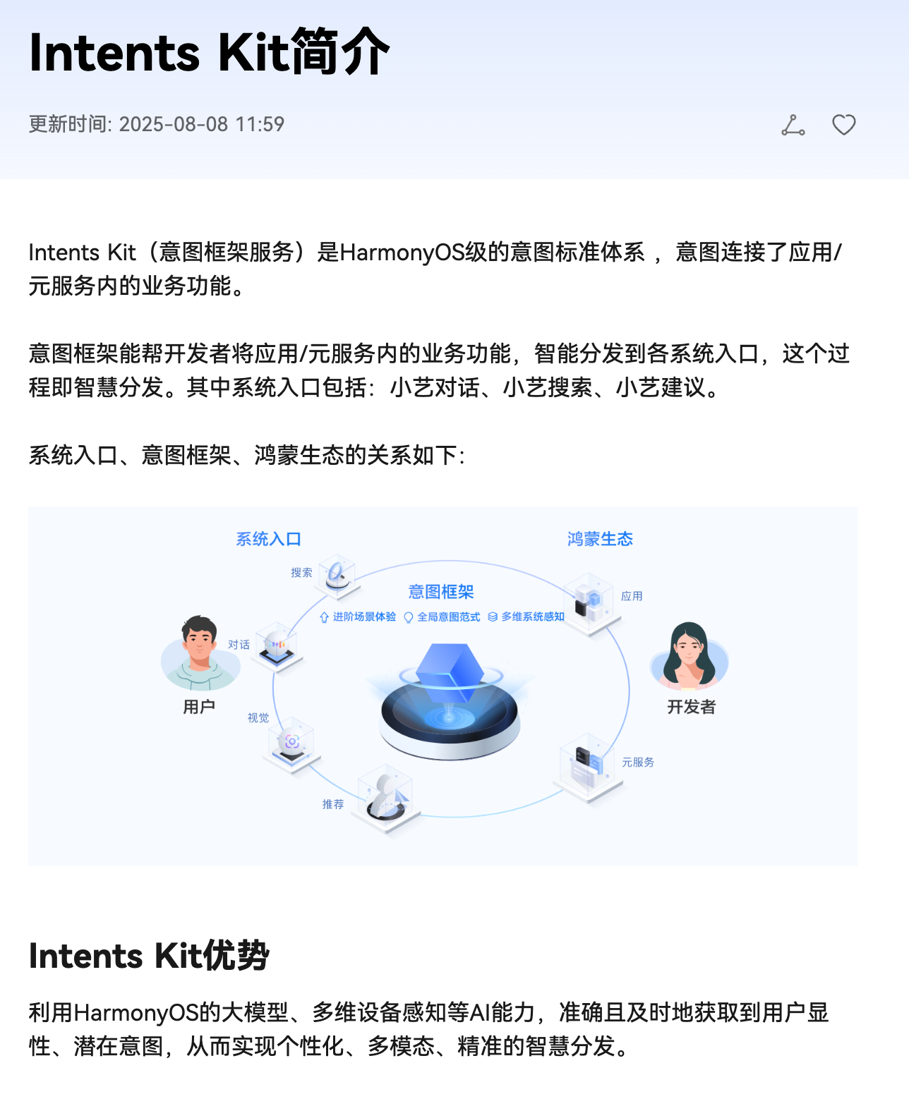 无独有偶的是,类似的功能快捷入口并非苹果独享,华为的 HarmonyOS 中也有一个类似的服务叫做 Intents Kit,负责连接系统入口与 app 或元服务内部的功能:
