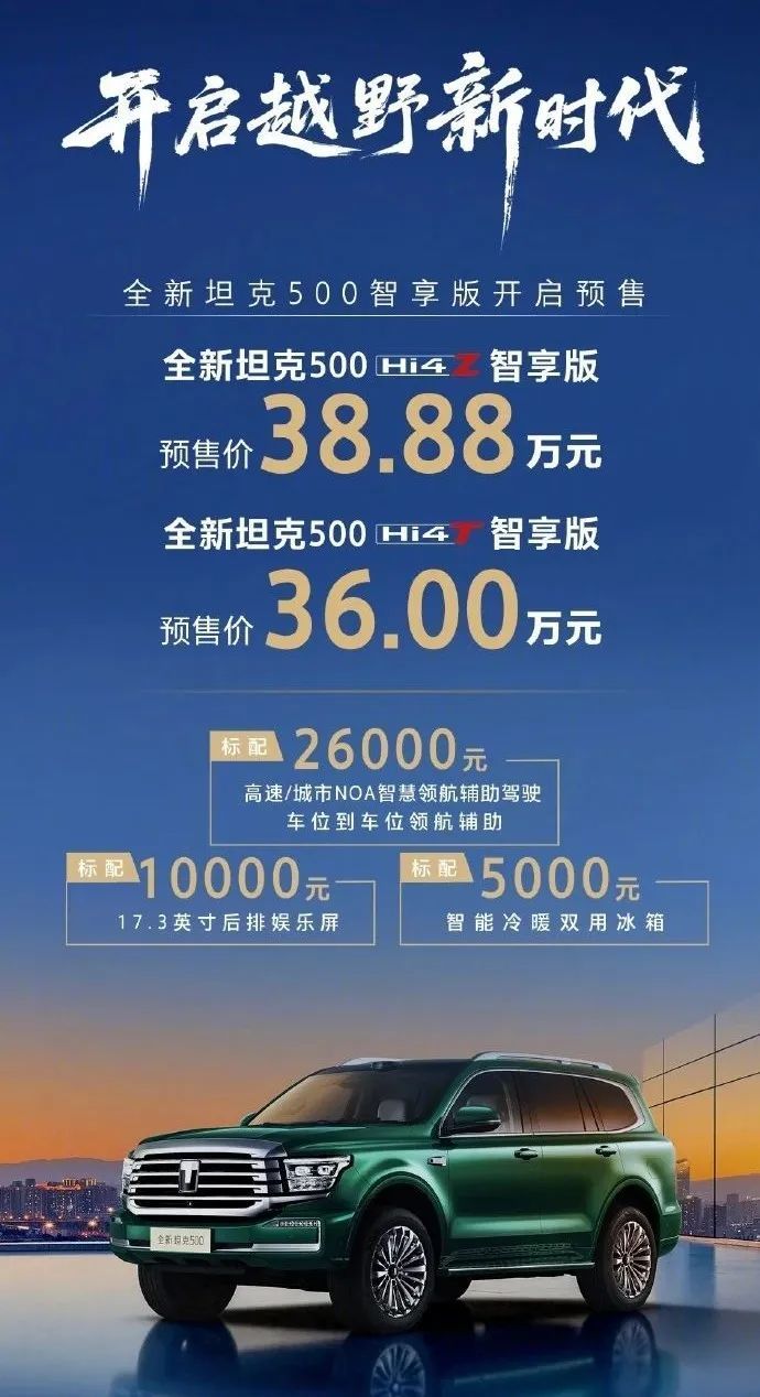坦克官方颇为自信地宣布,此次预售的全新坦克500升级搭载的车载冰箱、后排娱乐屏全标配,高速/城市NOA智慧领航辅助、车位到车位领航辅助终身免费,总价值为41000元。