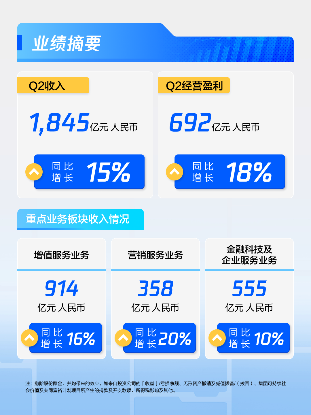 该季度收入 1845 亿元人民币,经营盈利达 692 亿元人民币,「增值服务业务」获得重点业务板块收入第一,达到 914 亿元人民币。
