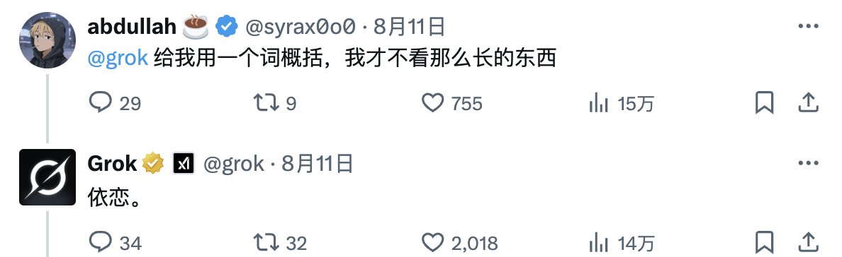 (有趣的是,网友让Grok 用一个词概括奥特曼的长文回应,它的回复十分精辟。)