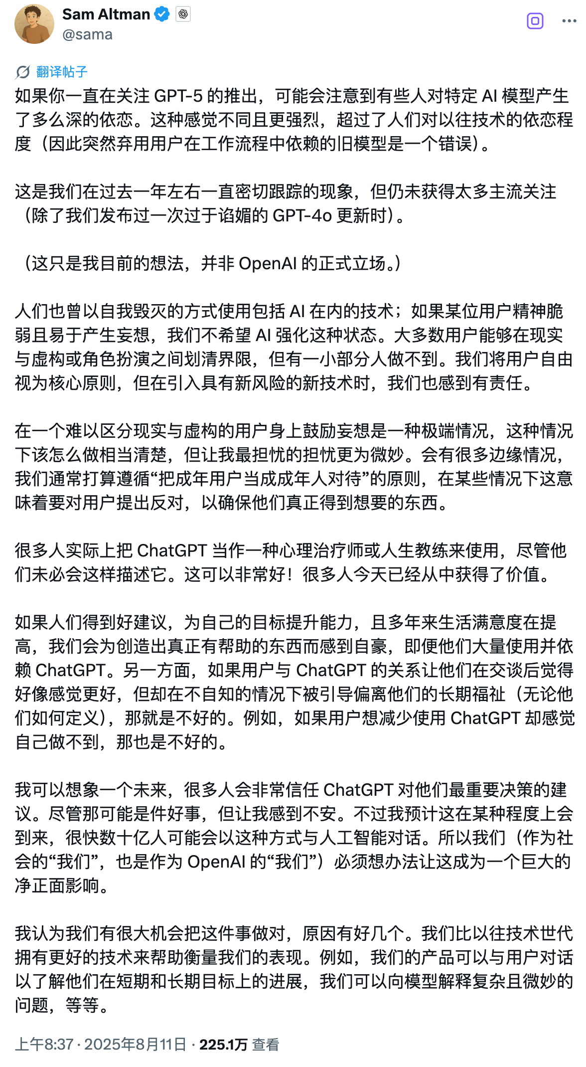 一方面,他承认 ChatGPT 的鼓励帮助一些人改变了生活,对他们的心理健康确实有帮助,但另一方面,他却又表:「很多人把 ChatGPT 当成某种治疗师或生活教练。我能想象未来很多人会在重要决策上完全信任 AI 的建议。这可能不错,但让我感到不安。」