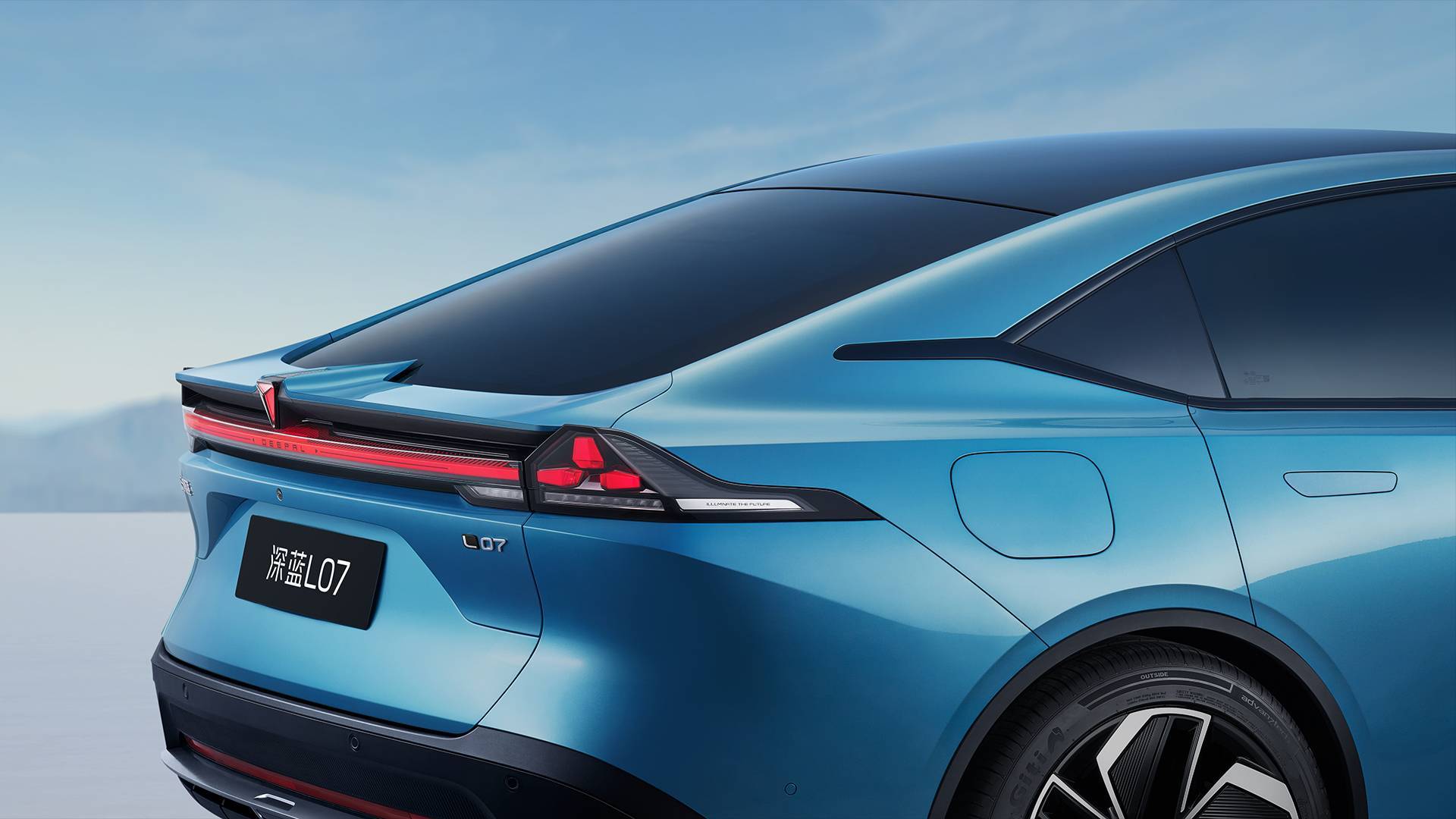 深蓝 L07 车身侧面的腰线从前翼子板延伸到车尾,配合溜背造型勾勒出了较强的运动感;车身门把手则是隐藏式弹出设计,同时轮眉和侧裙版部分都设计了隆起的筋线,轮毂则采用了五幅式 Y 字形轮毂。