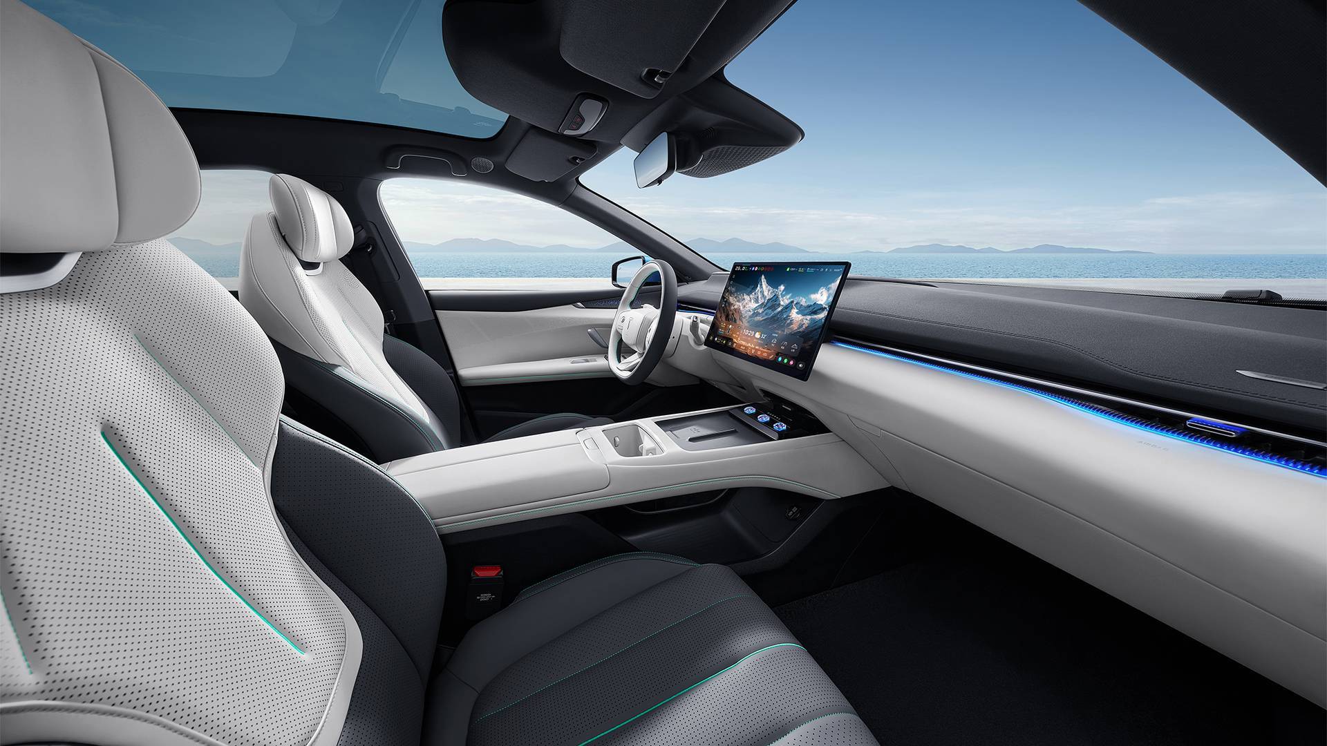 来到车内,深蓝 L07 的座舱设计也依然是家族式风格,配备了三幅式多功能方向盘、55 英寸 AR-HUD 抬头显示系统、15.6 英寸 2.5K 分辨率悬浮式中控屏以及电子怀挡,主驾驶前方则并未配备传统的仪表台。新款车型车机芯片升级到了高通骁龙 8295P,车机系统升级为 Deepal OS 4.0,新增内置 AI 智能座舱助手,支持 Carplay、Hicar、Carlink 等手车互联功能,可以实现应用分屏功能。