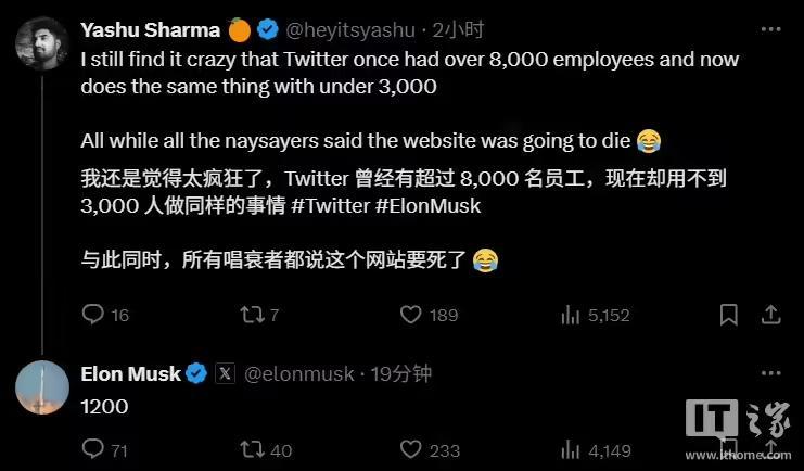 IT之家 8 月 14 日消息,一位 X 用户今日发帖称:“我仍然觉得推特曾经有 8000 多名员工,现在却只有不到 3000 人,这很疯狂。所有的反对者都说这个网站要完蛋了。”