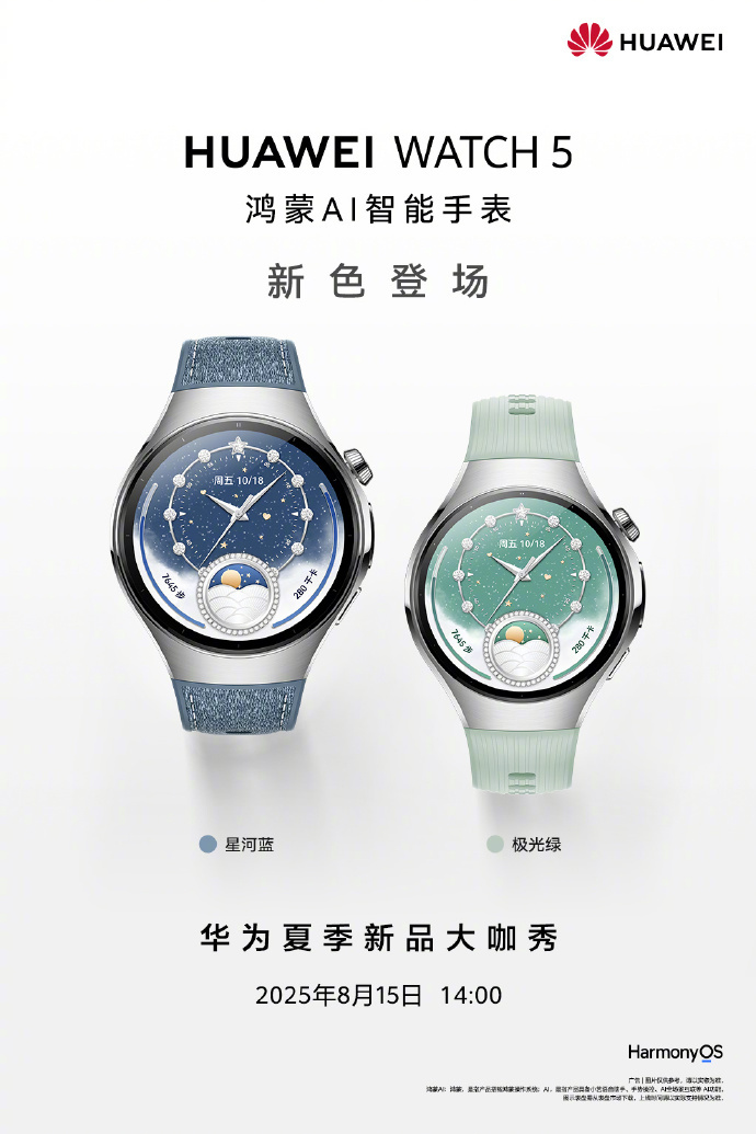 凤凰网科技讯 8月15日,华为宣布推出WATCH 5星河蓝与极光绿两款新配色,并明确这两款新配色将在今日举办的华为夏季新品大咖秀上正式亮相。