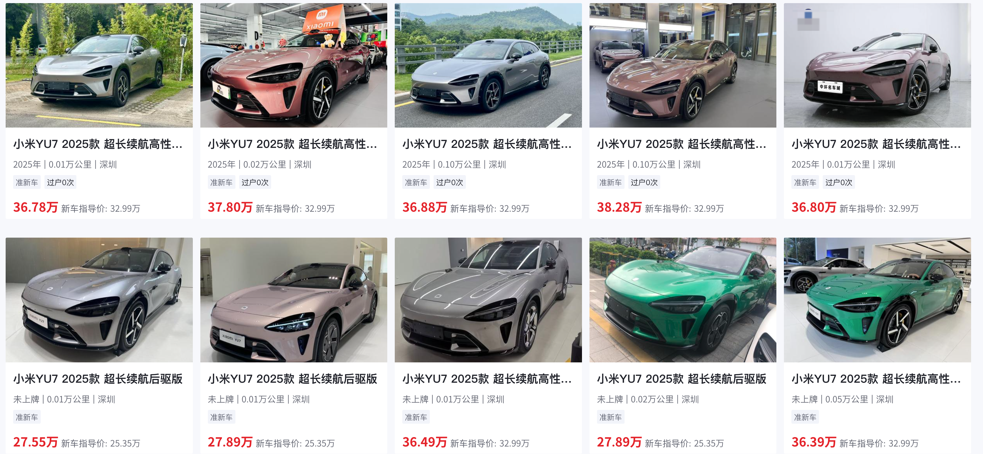 已经交付的小米 YU7 在二手市场的价格也居高不下,原价为 25.3 万元的 YU7 标准版在二手车商处的最低价格为 26.8 万元左右。SU7 和 SU7 Ultra 的二手车价格则随着保有量上的上升而有一定程度的下降。