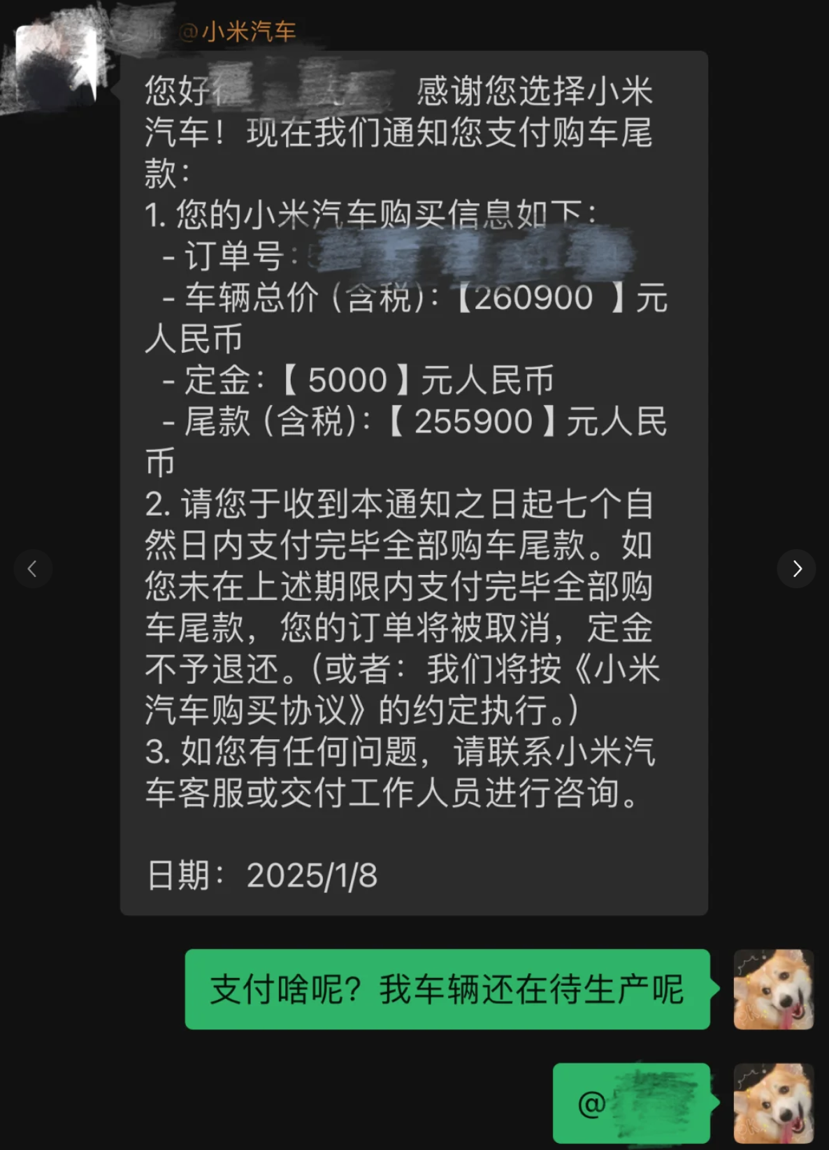 最近社交媒体上也有不少车主发帖称其在车辆尚未生产或者交付周期仍有数月的情况下被要求先行支付尾款,否则订单将被取消且定金不予退还。