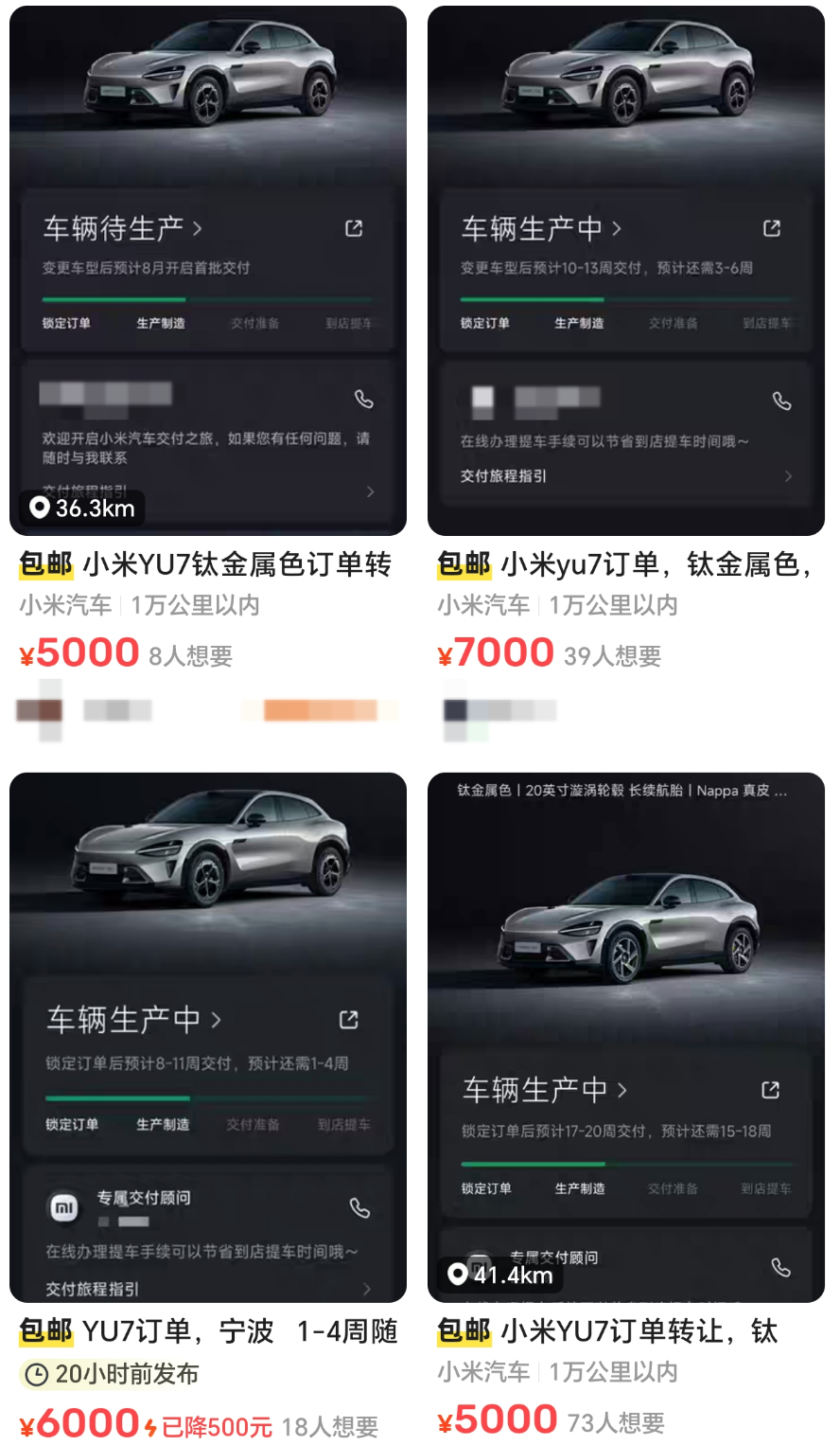 目前在二手平台上以「小米 YU7」为关键词进行搜索,有相当多的车主在转让生产排期较为靠前的订单,普遍加价幅度在 2500 元至 5000 元不等,但由于小米官方并不支持变更提车人,因此大多数人采用的是在提车后进行「手拉手」过户的方式。