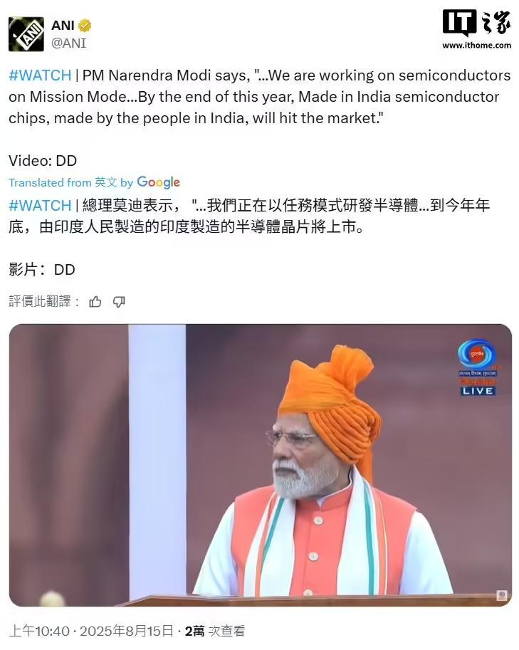 IT之家 8 月 15 日消息,印度总理纳伦德拉・莫迪在今天的独立日演说中宣布,印度首款国内制造的半导体芯片预计将在 2025 年底上市。