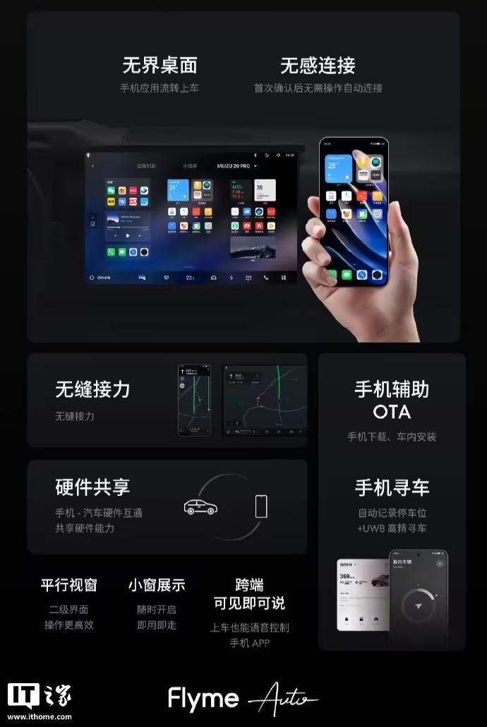 作为参考,Flyme Auto 车载软件系统发布于 2023 年 3 月,Flyme Auto 手机域支持无界桌面和无感连接功能。无界桌面支持手机应用流转上车,无感连接可以在首次确认后无需操作自动连接。支持无缝接力、手机辅助 OTA、手机-汽车硬件互通共享硬件能力,支持手机寻车,支持平行视窗、小窗展示、跨端可见即可说等。