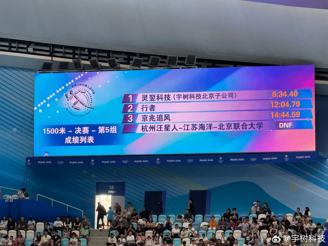 这届运动会,宇树带着两支队伍,一支由宇树科技带领,另一支由宇树科技旗下的子公司北京灵翌科技带领。第一组1500米比赛里,宇树科技以7分10秒28拿下小组第一。随后,北京灵翌科技带领的宇树H1拿下了1500米比赛冠军,成绩为6分34秒40,获得了5万元奖金。