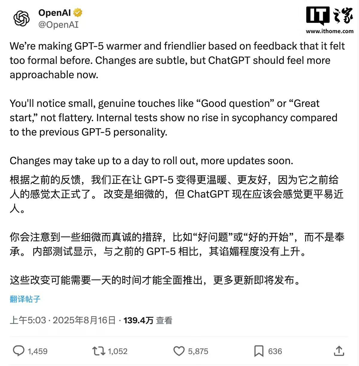 IT之家 8 月 16 日消息,OpenAI 今天凌晨宣布,根据先前的反馈正在让 GPT-5 变得更温暖、更友好,现在开始将会使人感觉“更加平易近人”。OpenAI 也坦承说,GPT-5 之前给人的感觉“太正式”。