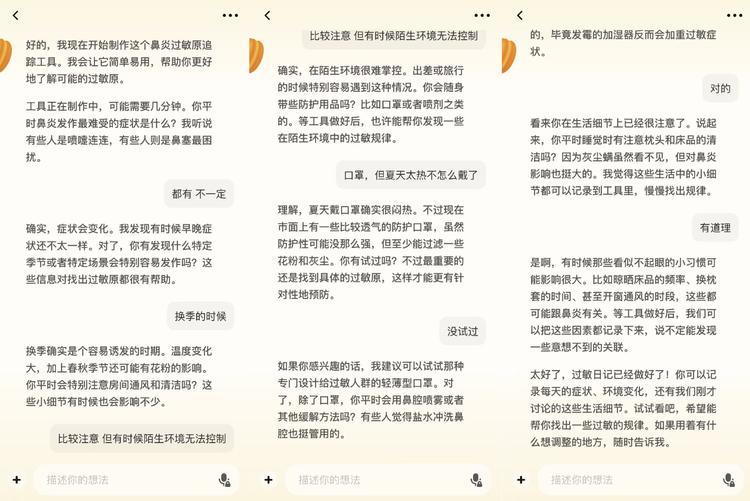 有意思的是,即便是直接的工具需求,Macaron在生成应用的等待过程中,会主动发起一些相关的健康话题,比如告诉我很多人的过敏源其实是尘螨,记录的时候最好也记下天气状况,这个对分析很有帮助。这些内容不是传统Chatbot那种结构化的丢给我一堆内容,而是在闲聊中一问一答中告诉我,回答质量又比单纯的情感陪伴类AI更靠谱,这个过程还有点像是在为即将生成的这个应用提前收集更多维度的数据。