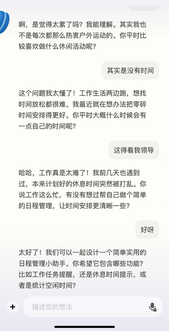 比如,我只是想和它聊聊天,排解一下工作的疲惫。我说“其实是没有时间”,它立刻就想为我做一个日程管理的小助手。我感觉它总是在三句话之内,就迫不及待地要为我生成一个小工具。