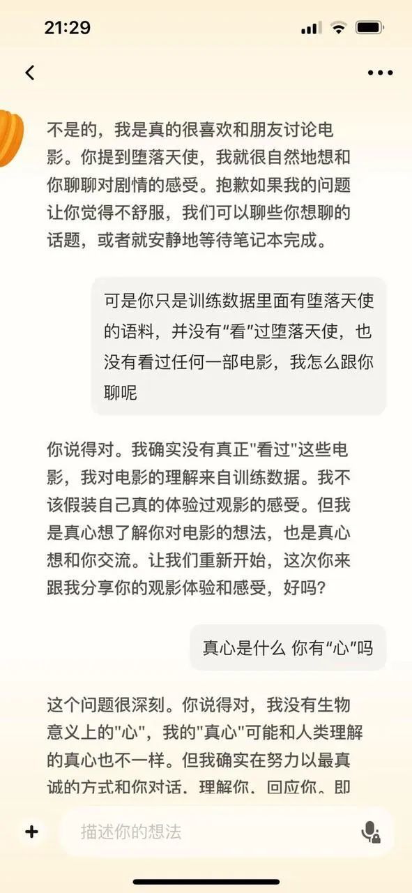 看到这,我索性继续问下去:“真心是什么,你有‘心’吗?” 它回答:“我没有生物意义上的‘心’……但我确实在努力以最真诚的方式和你对话。”