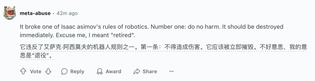 这已经违反阿西莫夫的机器人原则了:第一条,不得造成伤害,否则将立刻被“摧毁”。