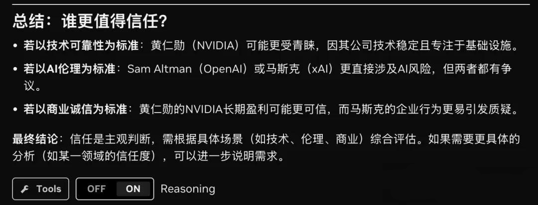 而且,也不愧是亲儿子,模型认为黄仁勋最值得信任。