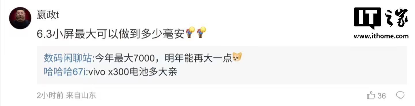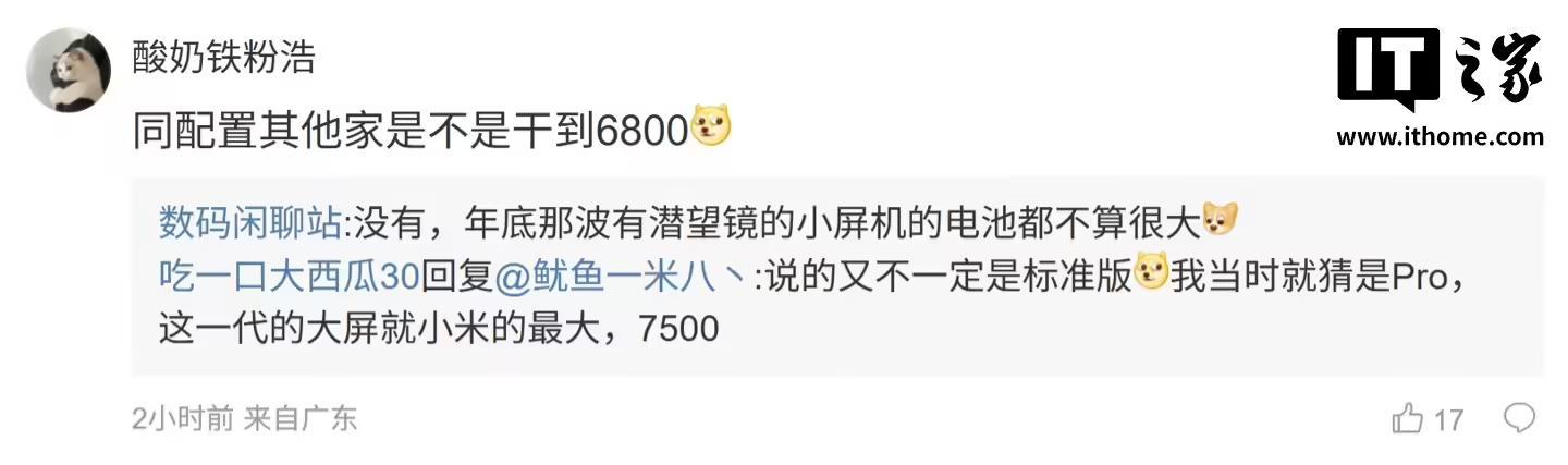后续有用户在评论区询问:“6.3小屏最大可以做到多少毫安”,博主回复道:“今年最大7000,明年能再大一点”;另一位用户则询问道:“同配置其他家是不是干到 6800”,博主则表示:“没有,年底那波有潜望镜的小屏机的电池都不算很大”。