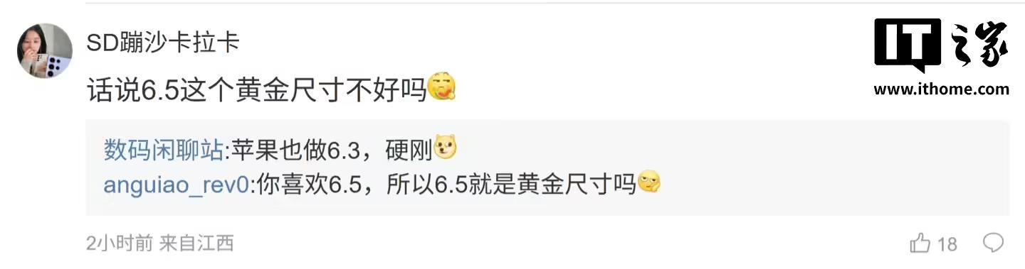 而另外一位网友则表示:“话说 6.5 这个黄金尺寸不好吗”,博主则回复道:“苹果也做 6.3,硬刚”。