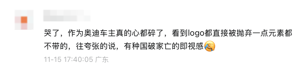 哭了,作为奥迪车主真的心都碎了,看到 logo 都直接被抛弃一点元素都不带的,往夸张的说,有种国破家亡的即视感。