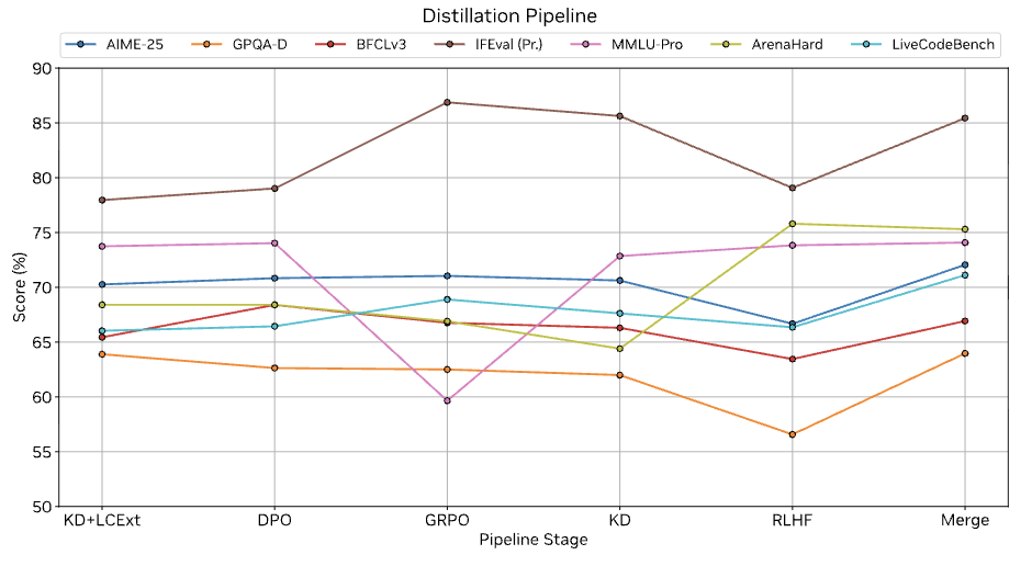 压缩:最后,基础模型和对齐模型均经过压缩(剪枝和蒸馏),支持在单个NVIDIA A10G GPU(22 GiB 内存,bfloat16 精度)上进行128k token的上下文推理。这一成果是通过扩展基于Minitron的压缩策略实现的,该策略专门针对受限条件下的推理模型压缩需求而设计。