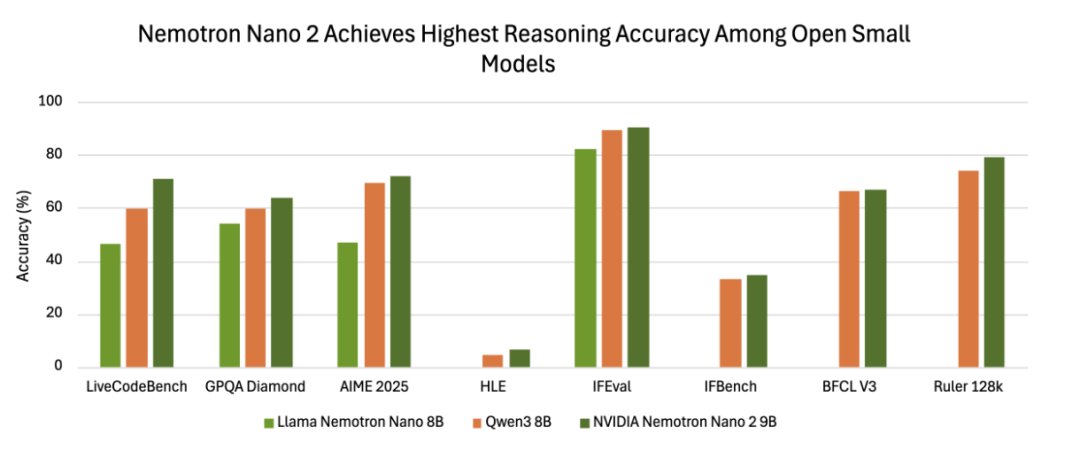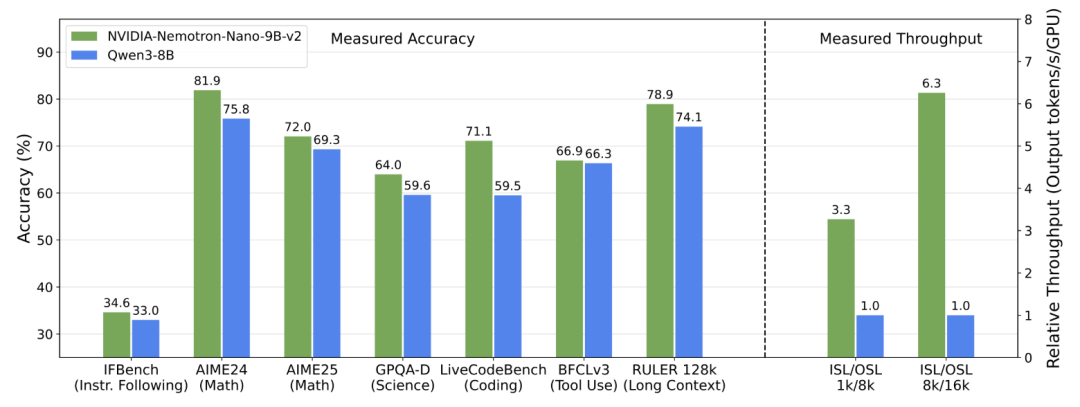 技术报告显示,Nemotron Nano v2在复杂推理基准测试上的准确率与同等规模的领先开源模型Qwen3-8B相当或更高,同时吞吐量——也就是模型速度——最高可提升6倍。
