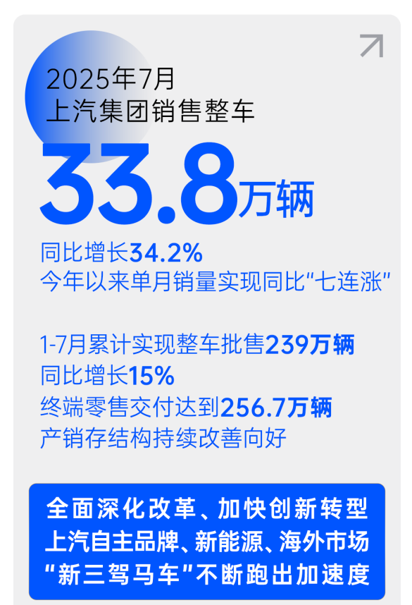 根据上汽集团发布的最新产销快报显示,2025年7月,上汽集团销售整车33.8万辆,同比增长34.2%,今年以来单月销量实现同比“七连涨”;1-7月累计实现整车批售239万辆,同比增长15%。