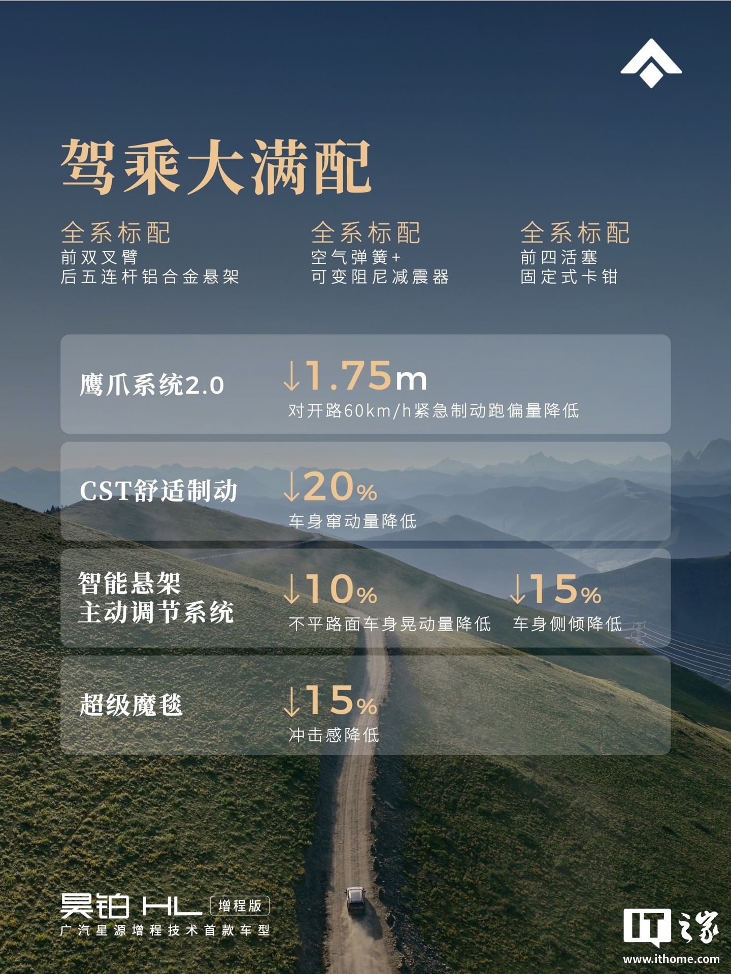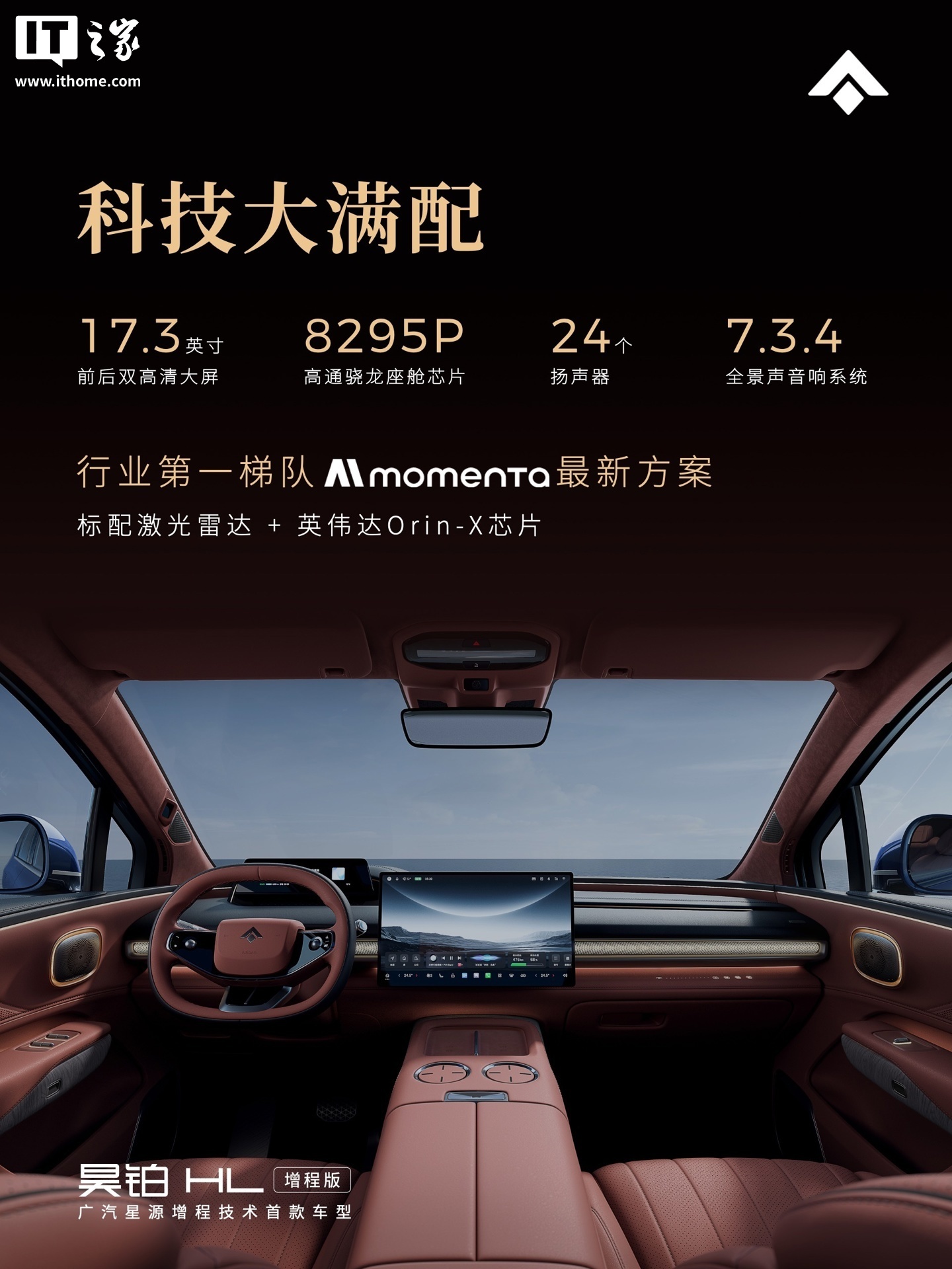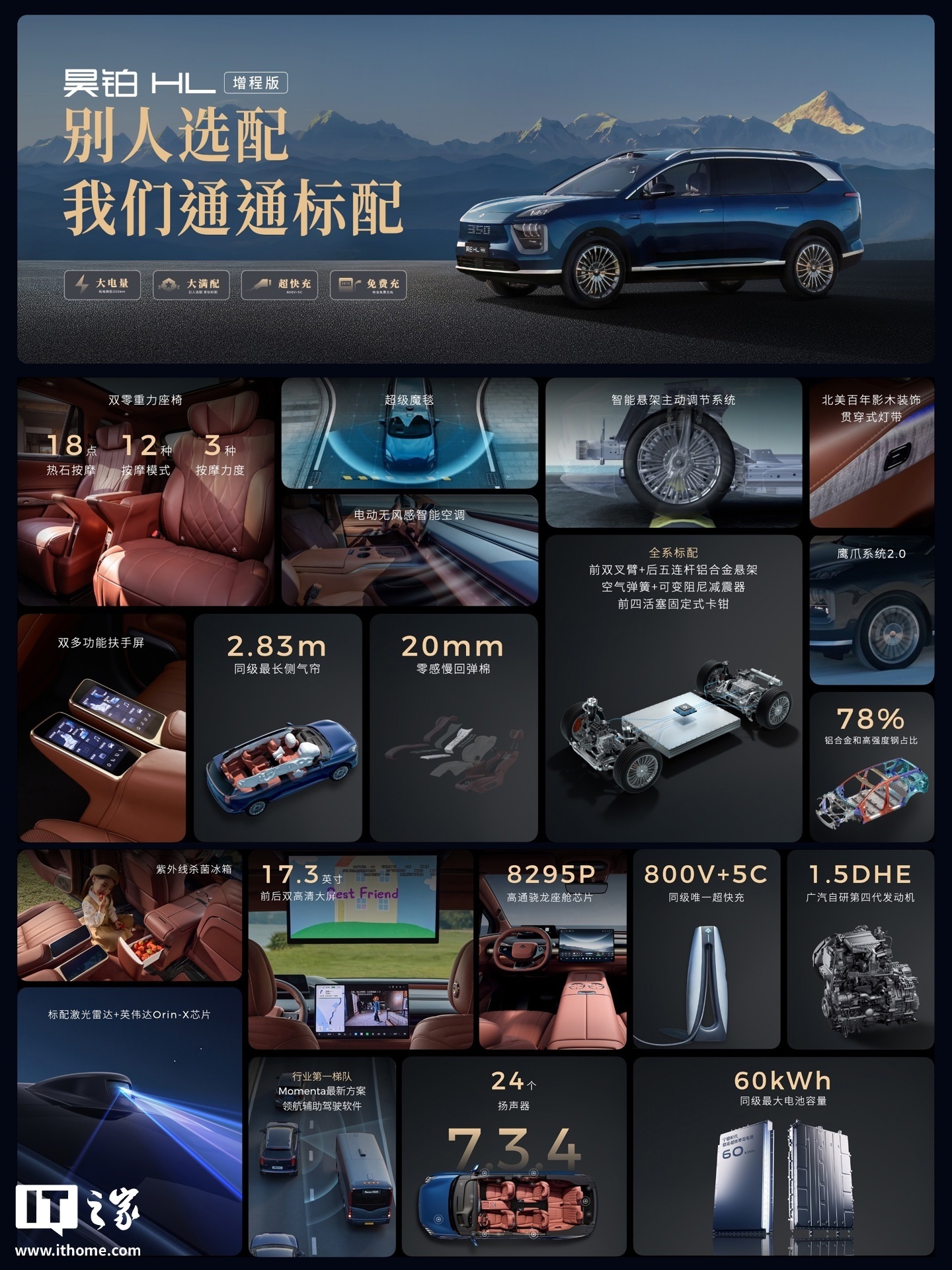 IT之家注意到,广汽昊铂 HL 增程版汽车标配双零重力座椅,拥有同级最多 18 点热石按摩;配备前后双 17.3 寸的高清大屏、8295P 芯片,标配 24 扬 7.3.4 全景声音响系统;标配激光雷达 + 英伟达 Orin 芯片的广汽 GSD 高级智能辅助驾驶系统;标配前双叉臂 + 后五连杆铝合金悬架、双腔空气弹簧 + 可变阻尼减震器、四活塞前固定式刹车卡钳、鹰爪系统 2.0 等。