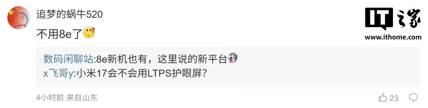 后续有用户在评论区询问:“不用 8e了”,博主回复道:“8e 新机也有,这里说的新平台”;另一位用户则询问道:“希望能调好天玑吧”,博主则回复道:“从此天玑调教多一家,谁垫底谁尴尬”。