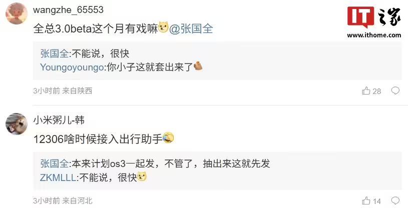 IT之家注意到,小米手机系统软件部总监张国全还在微博评论区回复了部分网友的问题:针对澎湃 HyperOS 3.0 Beta 版本能否本月推出,他表示“不能说,很快”;针对 12306 何时接入小米出行助手,他回复称“本来计划 OS3 一起发,不管了,抽出来这就先发”。