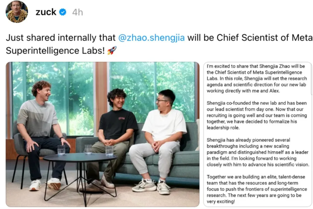 7月,Meta任命了Shengjia Zhao为超级智能实验室的首席AI科学家,他曾是OpenAI的研究员,也是ChatGPT、GPT-4的核心功臣。