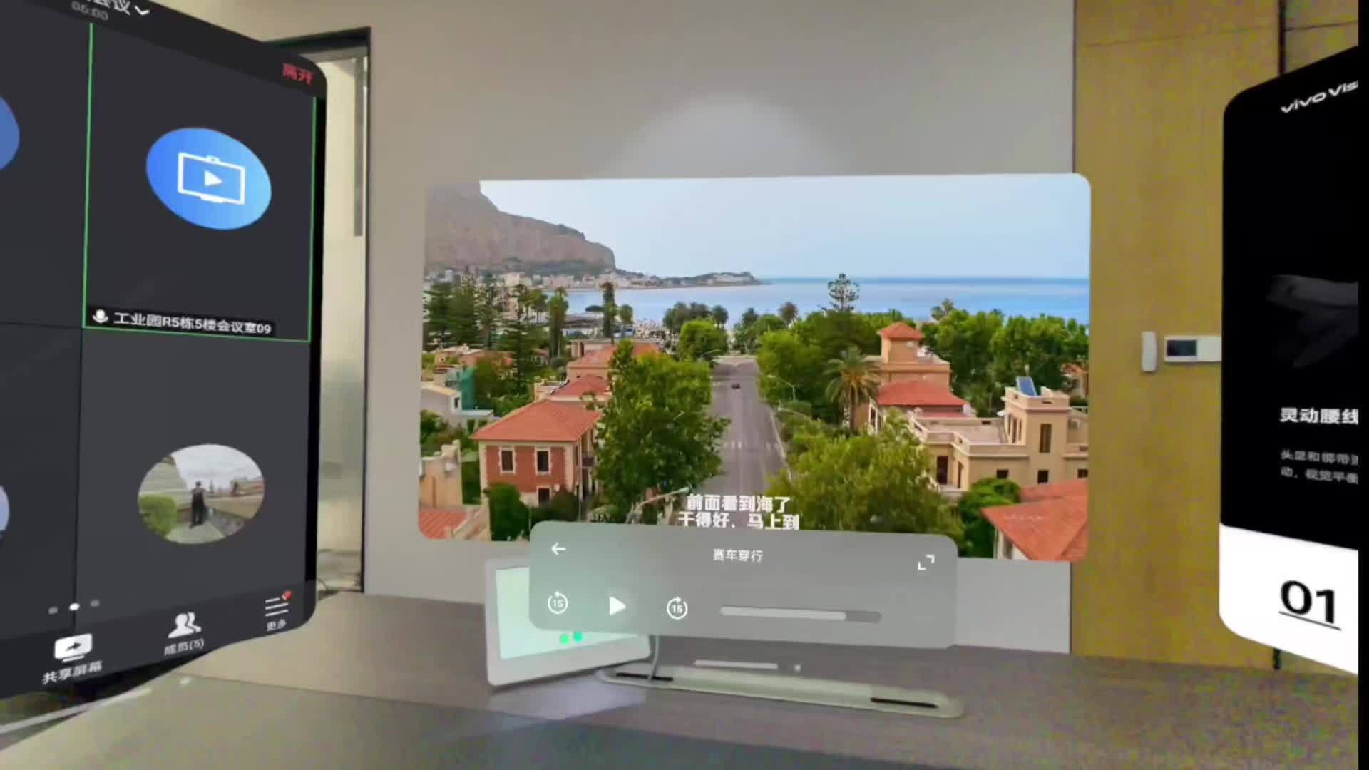 洪沂称在 vivo Vision 探索版上测试了几款办公应用,并分享了在混合现实空间里多任务处理的新视角。戴上 vivo Vision,眼前可以打开多个悬浮视窗,这些视窗都可以随意拖拽到合适的位置,缩放到想要的大小。视线一转就可以轻松切换任务,再也不用像电脑那样在无数个程序之间切来切去,感觉就像有个巨大无比的工作台环绕着你。