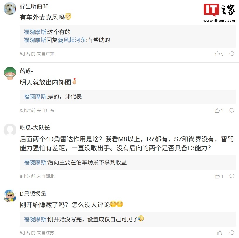 IT之家注意到,问界 M7 产品经理 @福碗摩斯 今日还在评论区回复了部分网友的问题:针对新车是否有车外麦克风,他表示“这个有的”;针对后面两个 4D 角雷达作用是什么,他回复称“后向主要在泊车场景下拿到收益”。