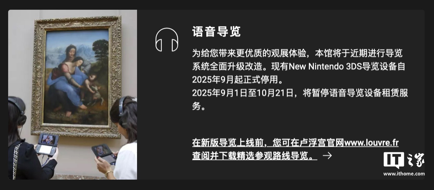 IT之家 9 月 7 日消息,据法国卢浮宫官网,卢浮宫已于 9 月 1 日正式停用“任天堂 3DS 语音导览设备”,9 月 1 日至 10 月 21 日馆内将暂停语音导览设备租赁服务,在新版语音导览器上线前,用户可以从卢浮宫官网查询并下载精选参观路线导览。