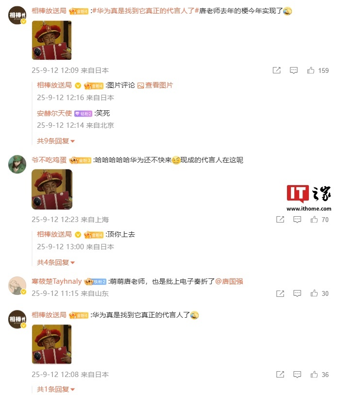值得一提的是,唐国强分享自己的 Mate XTs 非凡大师三折叠手机时,所使用的设备为华为 Mate XT 非凡大师三折叠手机。另有网友在唐国强的微博下评论“唐老师去年的梗今年实现了”、“也是批上电子奏折了”。
