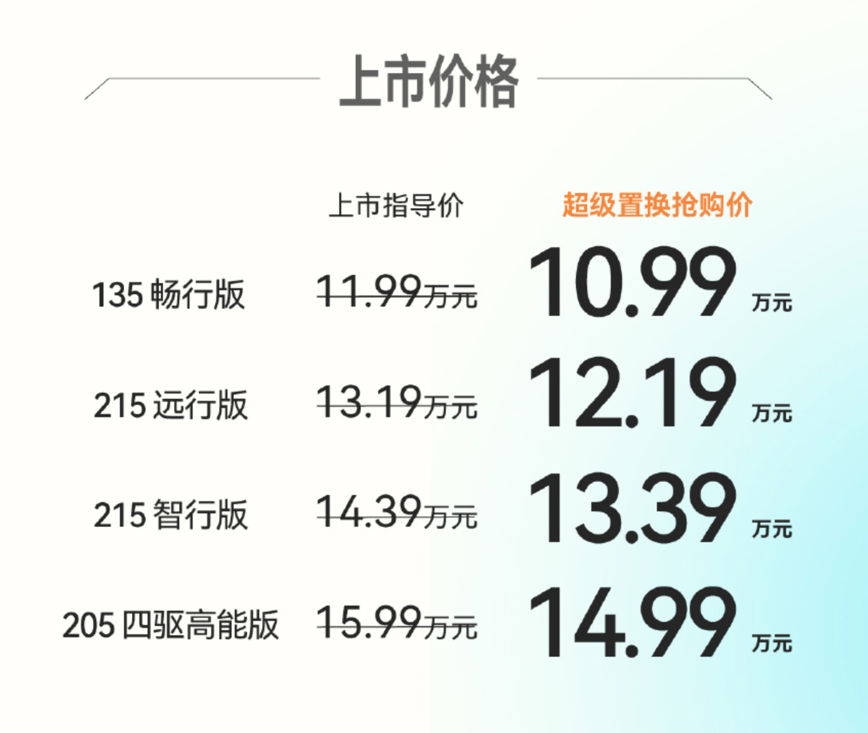 在定价上,风云 X3L 采取了共推出了四款配置,指导价为 11.99-15.99 万元,与同级的方盒子方程豹钛 3 和北汽 BJ40 增程版相比,价格上有明显优势。